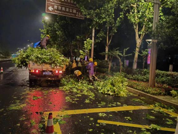 集團(tuán)濱江公園公司負(fù)責(zé)河西濱江風(fēng)光帶八大公園約17公里江河岸線的日常管養(yǎng)工作。為做好公園綠化安全生產(chǎn)保障工作,濱江公園公司全員出動(dòng),全力做好濱江公園園區(qū)硬質(zhì)設(shè)施檢查維護(hù)、倒伏樹(shù)木和大型斷枝消險(xiǎn)、園路及綠化內(nèi)落葉斷枝清理和積水點(diǎn)位助排等工作。在現(xiàn)場(chǎng)采用警戒繩、圍擋等避免行人游客接近,并對(duì)園內(nèi)存在安全隱患的宣傳橫幅和廣告牌等進(jìn)行回收和拆解。截至11日晚,濱江公園公司完成斜樹(shù)扶正18株、斷樹(shù)倒樹(shù)清理8株,基本完成園區(qū)道路兩側(cè)及周邊落葉斷枝等雜物清理。